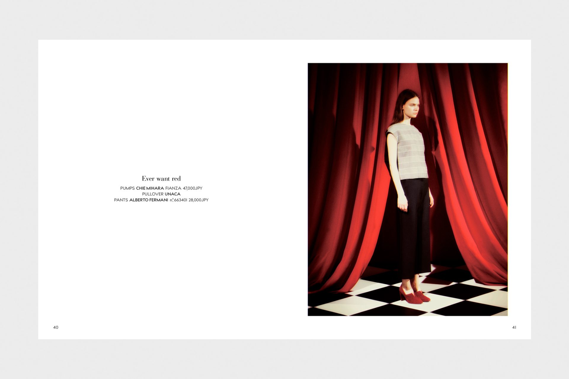 Art Director, Designer: Naoki Tsuji, Photographer: Masanori Akao, Stylist: Kayoko Murayama, Hair: Shingo Shibata, Make-up: Kie Kiyohara Set Design: Haruka Kogure